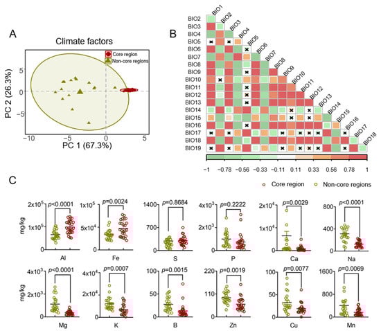Comparative analysis of environmental factors in different pomelo-collecting regions: (A) Principal component analysis of Euclidean distance for climatic factors in core and non-core region samples; (B) Auto-correlation of climatic factors by Pearson analysis; (C) Soil physical and chemical properties in rhizosphere soil samples from the core region differed from those in samples from the non-core region. Significance between core and non-core regions indicated by t-test. Red means core regions, and olive green means non-core regions.