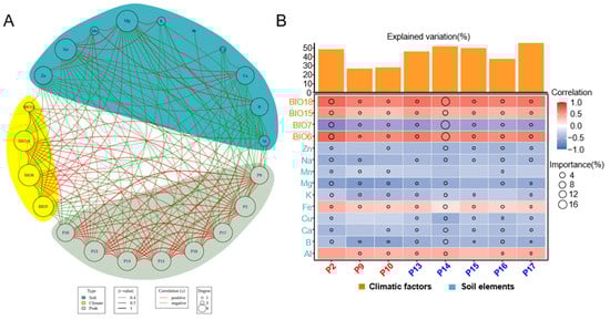 Correlation analysis of soil and climate elements with volatile compounds in pomelos sourced from core and non-core regions: (A) A network was constructed by correlation of compounds (grey), climatic factors (yellow), and soil elements (green). Node size corresponds to the degree of each node. The thickness and color of the edges denote strength and significance, respectively. Red and green lines indicate positive and negative correlations; (B) Contributions of soil physical–chemical properties and climatic factors to the components with varying levels among different regions in plants. P 10, α-terpineol; P13, γ-cadinene; P14, β-copaene; P15, γ-muurolene; P16, bicyclogermacren; P17 β-cadinene; P2, β-pinene; P9, terpinen-4-ol.