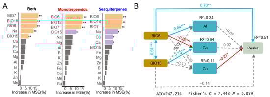 The major factors influencing volatile compounds evaluated by Random Forest and SEM analysis: (A) The main factors influencing the relative abundance of compounds were analyzed and evaluated based on a random forest model. Both means the sum of the relative abundances of monoterpene compounds and sesquiterpene compounds. The monoterpenes part represents the average relative abundance of monoterpene compounds included in the model. The sesquiterpenes part represents the average relative abundance of sesquiterpene compounds included in the model; (B) The direct and indirect relationships between climatic factors, soil elements, and the total relative abundance of compounds, assessed based on structural equation modeling (SEM). The arrows represent the direction of hypothesized causation. The red line represents adverse effects, the blue line represents positive effects, and the gray line represents no significant effect. * p < 0.05, ** p < 0.01 and *** p < 0.001. In this part, “peaks” means the sum result of the relative peak areas of the eight selected compounds.