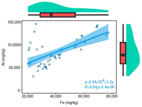 Pearson Correlation analysis of Fe and Al elements in soil. Green shows the data’s kernel density, red represents the data distribution in the box plot, and the blue area indicates the 95% confidence interval.