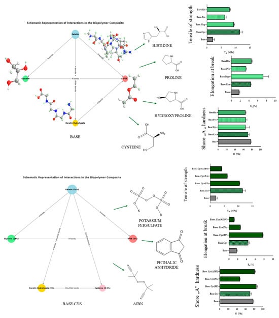 The introduction of histidine as a crosslinking agent, as well as the use of cysteine and proline, significantly improved the relative elongation parameter (Eb), as discussed in the section on the static-mechanical analysis. This influence is closely related to the presence of hydrogen bonds, which, unlike the stronger covalent bonds with an energy of 30–120 kcal/mol, have lower geometrical and physical requirements, with energies in the range of 2–40 kcal/mol.