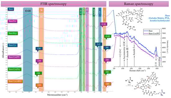 FTIR spectra of Base, Base.Pro, Base.Hyp, Base.Cys, Base.Cys(PP), Base.Cys(PA), and Base.Cys(AIBN), as well as IR Raman spectra of Base and Base.Cys(PP) used for comparative analysis.