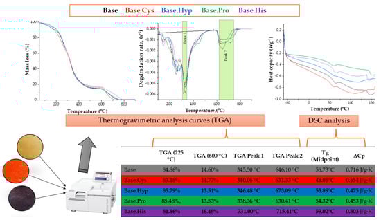 Heating rate curves as a function of temperature (Figure 3) indicate the time-dependent thermal relaxation of gelatin-based polymers. These transitions probably reflect the physical behavior of gelatin and are consistent with data from the literature [20,24]. The study considered the effect of amino acids such as cysteine (Cys), hydroxyproline (Hyp), proline (Pro), and histidine (His) on the base material (Base). The first changes in heat flow, as seen in the DSC curves, are attributed to the transformation from a rigid and elastic state to a so-called “rubbery” state—viscoelastic state, which is the result of the Brownian motion of the molecules and macromolecules of the biopolymer [19].