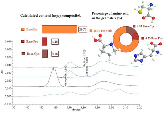 The analysis of the content of histidine, cysteine, and proline in the polymer materials was carried out using reversed-phase liquid chromatography with UV detection (Figure 4). The figure shows the percentage of each amino acid in the materials analyzed. The HPLC chromatograms list the amino acids that are the crosslinking agents in the gelatin materials and determine their proportion in the gelatin matrices.