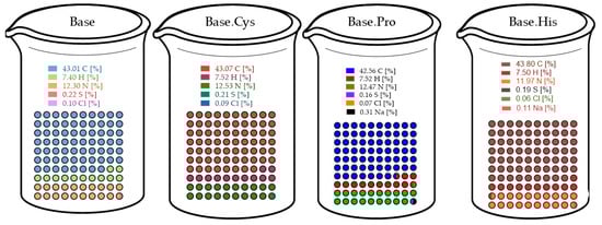 Comparison of elemental content in Base, Base.Cys, Base.Pro, and Base.His samples obtained by elemental analysis.
