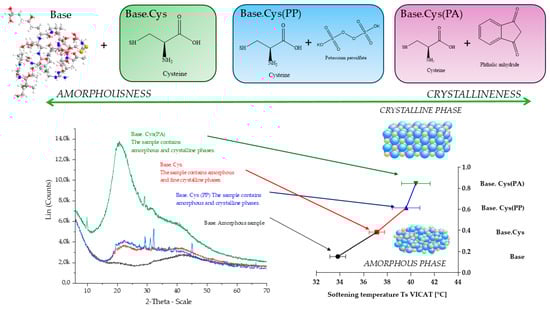 Effect of cysteine and initiators on the crystalline and amorphous structure of gelatinous materials. XRD and softening temperature (Vicat) analysis for Base, Base.Cys, Base.Cys(PA), and Base.Cys(PP).