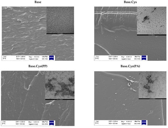 The Base.Cys(PP) and Base.Cys(PA) samples showed partially homogeneous and locally irregular structures, with more noticeable heterogeneity evident in the Base.Cys(PP) sample. Images of this sample revealed a very rough surface with prominent hump-like highlights or fuzzy foliations. In the case of the Base.Cys(PA) sample, the presence of fine particles with diameters exceeding 2 μm was observed, which may represent residual PVA or unreacted initiator particles. These particles form single agglomerates or clusters visible at 50,000× magnification.