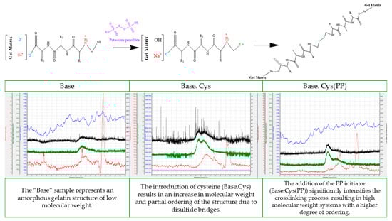 The addition of cysteine present in the enzymatic hydrolysis of keratin, a key reinforcer of gelatin matrices, further enhances the stability of the system. Keratin has high stability due to the presence of numerous intermolecular bonds between polar and non-polar amino acids. In a further stage of the study, the selected initiator was used in combination with crosslinking agents, including cysteine, introducing it into the polymer matrices. Preliminary physicochemical studies have shown a similarity in the properties of the gel matrix to the samples with cysteine. The best mechanical parameters were distinguished by the Base.Cys(PP) material, in which the tensile strength increased compared to the native sample and approached the TS value of the single-component Base.Cys system. This is probably due to the presence of cysteine forming additional bonds with keratin in the gelatin matrix. The effectiveness of the resulting interactions increased after the addition of an initiator that activates the formation of ionic bonds in the polypeptide chain.