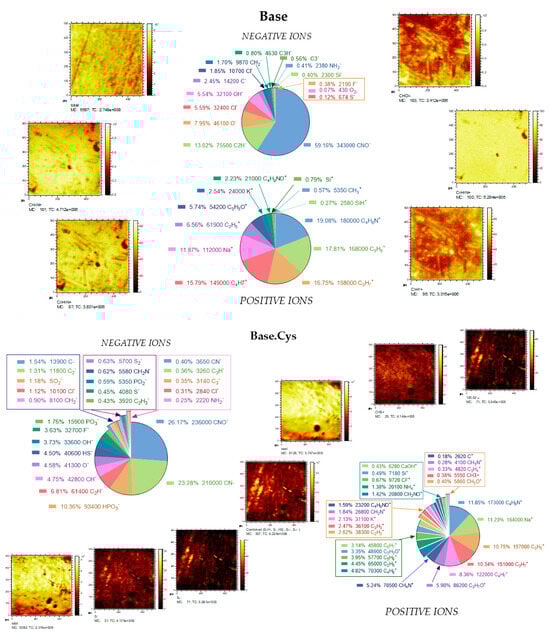 The sulfur (S) content in the Base sample is 0.21 ± 0.07% and does not change significantly in the Base.Cys sample (0.22 ± 0.07%). The minimal increase in sulfur content indicates the presence of thiol groups of cysteine, which are crucial for the formation of disulfide bridges that stabilize the matrix. In the Base.Pro sample, the sulfur content drops to 0.16 ± 0.05%, consistent with the absence of sulfur groups in proline. In the Base.His sample, the sulfur content remains at 0.19 ± 0.06%, indicating that histidine has no effect on this parameter.