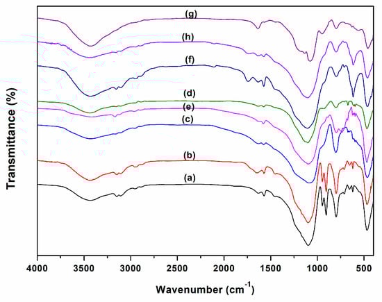 FT-IR spectra of (a) IL−MoO4@nano−SiO2, (b) IL−OH@nano−SiO2, (c) IL−HOCH2COO@nano−SiO2, (d) IL−BF4@nano−SiO2, (e) IL−SbF6@nano−SiO2, (f) IL−CH3COO@nano−SiO2, (g) IL−AlO2@nano−SiO2, and (h) IL−HCO3@nano−SiO2.