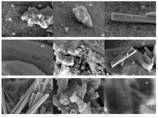 SEM images of (a) IL−MoO4@nano−SiO2, (b) IL−OH@nano−SiO2, (c) IL−HOCH2COO@nano−SiO2, (d) IL−BF4@nano−SiO2, (e) IL−SbF6@nano−SiO2, (f) IL−CH3COO@nano−SiO2, (g) IL−AlO2@nano−SiO2, (h) IL−HCO3@nano−SiO2, and (i) nano−SiO2.
