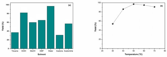 Due to the exceptional activity of IL-SbF6@nano-SiO2, it was selected as the model catalyst to optimize the reaction parameters. Figure 3a illustrates the effect of different solvents on the reaction. The influence of seven solvents, namely toluene, EtOH, MeOH, DMF, H2O, acetone, and acetonitrile, on the reaction, was assessed. It was revealed that the highest product yield was achieved when H2O was employed as the solvent. Subsequently, the influence of reaction temperature was assessed. The results, presented in Figure 3b, demonstrated significant variations in yield as the reaction temperature increased to 50 °C. According to the figure, employing 50 °C is enough to complete the reaction, and a high product yield of 97% was achieved, while lowering the temperature to 30 °C resulted in a decrease in the reaction yield. After that, with a further increase in the temperature to 70 °C, the product yield was slightly decreased due to the formation of side products. The influence of CO₂ pressure on catalytic activity was investigated. As shown in Figure 3c, increasing the reaction pressure from 0.1 to 0.3 MPa significantly enhanced the catalytic activity. Further increasing the pressure to 0.5 MPa led to a slower decrease in activity. Consequently, 0.3 MPa was identified as the optimal reaction pressure. The effect of reaction time was also examined (Figure 3d). As shown, by increasing the reaction time from 1 h to 3 h, the catalytic activity increased and reached the maximum value at 3 h, and no significant improvement was observed with further increases in reaction time.