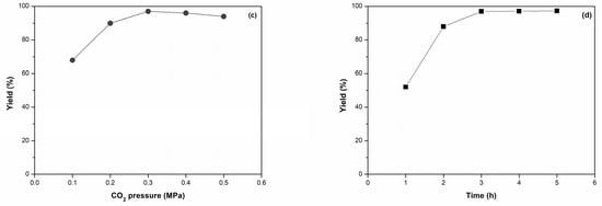 (a) Effect of solvent (10 mmol N-benzylprop-2-yn-1-amine, 0.4 g IL-SbF6@nano-SiO2, 10 mL solvent, 0.3 MPa CO2, 50 °C, and 3 h), (b) effect of temperature (10 mmol N-benzylprop-2-yn-1-amine, 0.4 g IL-SbF6@nano-SiO2, 10 mL H2O, 0.3 MPa CO2, and 3 h), (c) effect of pressure (10 mmol N-benzylprop-2-yn-1-amine, 0.4 g IL-SbF6@nano-SiO2, 10 mL H2O, CO2, 50 °C, and 3 h), and (d) effect of reaction time on the reaction (10 mmol N-benzylprop-2-yn-1-amine, 0.4 g IL-SbF6@nano-SiO2, 10 mL H2O, 0.3 MPa CO2, and 50 °C).