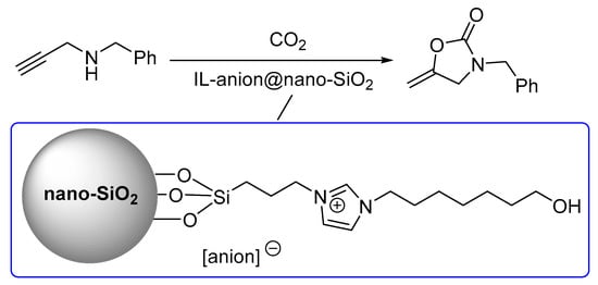 Ionic liquids (Ils), which are low-melting salts with customizable cations and active nucleophilic anions, have been described as green solvents with significant advantages over many other catalysts, primarily due to their extraordinary activity and selectivity, good thermostability, low vapor pressure, and non-flammability [23,24,25,26,27]. By modifying their cations and/or anions, Ils can serve as efficient catalysts for the capture and conversion of CO2 into 2-oxazolidinones [28,29,30]. However, Ils encounter challenges such as catalyst separation and high viscosity, which inevitably impede their practical application to a certain extent. In this regard, there is increasing interest in the heterogenization of various Ils. Ils can be immobilized onto various carriers such as zeolite, mesoporous silica, and porous carbon material, etc., which possess the benefits of sufficient contact and easy separation of heterogeneous catalysis for CO2 transformation [31,32,33,34]. Compared with inorganic and organic carriers nano-SiO2 nanoparticles possess unique structural features such as their large surface area, well-defined surface, low price, and appropriate thermal and mechanical properties, and are an ideal type of solid carrier for the immobilization of Ils [35,36,37,38]. The literature clearly indicates that silica-supported, imidazolium-based Ils could serve as effective heterogeneous catalysts in CO2 conversions. However, compared to homogeneous Ils, most heterogeneous counterparts generally show inferior reaction conditions and conversions. With this in mind, there remains a significant demand for developing highly efficient heterogeneous catalysts that can match the catalytic performance of homogeneous imidazolium-based Ils. Herein, a series of nano-SiO2-supported ionic liquids were synthesized via a covalent bond (https://www.sciencedirect.com/topics/pharmacology-toxicology-and-pharmaceutical-science/covalent-bond, URL (accessed on 29 January 2025) linkage method. The as-developed nanocomposite catalysts were explored as the heterogeneous catalysts for the carboxylative cyclization reaction of propargylic amines and CO2, providing excellent activity to produce 2-oxazolidinones under mild conditions (Scheme 1).