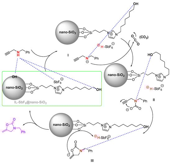 In light of the experimental data and literature references [11,12,13,14,15,16], a possible reaction mechanism for the carboxylative cyclization of CO2 with propargylic amines, catalyzed by IL-SbF6@nano-SiO2, was proposed and depicted in Scheme 2. Initially, the OH groups and SbF6 of the nanocatalyst work together to activate the propargylic amines through hydrogen bonding, followed by the deprotonation of the N-H bond to form the intermediate I. The outstanding catalytic performance of IL-SbF6@nano-SiO2 may be attributed to the synergistic effect of the two active sites. Next, the intermediate I carries out an electrophilic attack on propargylic amines by CO2, forming a carbamate intermediate II. Subsequently, intramolecular cyclization ensues, wherein the negatively charged oxygen in the carbamate triggers an attack on the triple bond to form the intermediate III. This sequence culminates in the generation of the final product via the protonation process, thereby regenerating the catalyst and completing the catalytic cycle.