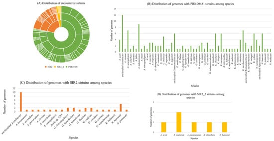 Distribution of encountered sirtuins among AAB species and their genomes. (A) The sunburst chart at the top left visually represents the hierarchical distribution of three types of sirtuin protein family models: SIR2 (orange), SIR2_2 (yellow), and PRK00481 (green). The innermost circle categorizes these three types, and as you move outward, each segment represents genera and then species. The size of each segment correlates with the number of genomes containing that particular sirtuin. This chart highlights the diversity and prevalence of these sirtuins across different species. The colors of marked sirtuins in sunburst chart correspond to colors in the clustered column charts. Most species have been found to have PRK00481 sirtuins. (B) On the other hand, fewer species have SIR2 and SIR2_2 sirtuins (C,D). Even the number of genomes is averagely higher when looking at the graph of “Distribution of genomes with PRK00481 sirtuins among species”.