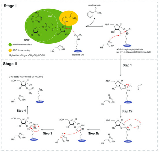 The image depicts the potential catalytic mechanism of NAD+-dependent deacetylation by SIR2 family proteins in AAB. This figure has been adapted from Figure 4 in A Molecular Perspective on Sirtuin Activity, Int. J. Mol. Sci., 2020, 21, by Carla S. S. Teixeira et al. [30].