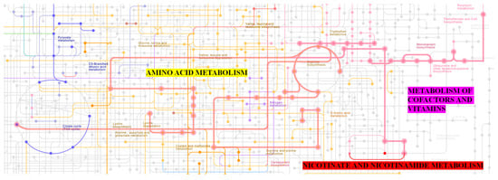 Scheme of metabolic pathways of AAB (specifically Entomobacter blattae) [40]. The red line pathway on the right, above the sign “nicotinate and nicotinamide metabolism”, shows NAD+-dependent protein deacylase activity, and the red dot above shows nicotinamide mononucleotide (NMN). The nicotinate and nicotinamide metabolism are a part of a larger network of metabolism of cofactors and vitamins. The network metabolism of cofactors and vitamins is displayed with thickened pink lines and dots. This network is deeply entangled with other metabolism processes, especially with the network of amino acid metabolism displayed with yellow lines and dots.