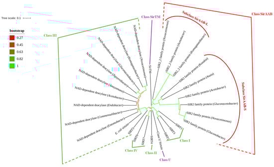 Unrooted phylogenetic tree representing positions of AAB sirtuins among representatives of established classes of sirtuins. Sirtuins labeled from SIRT1 to SIRT7, Class U sirtuin, E. coli sirtuin, and SirTM represent the reference sequences, which are surrounded by sequences of different AAB genera. SIRT1-SIRT7 represent human sirtuins, Class U sirtuin is represented by Geobacillus sp., and the SirTM sirtuin by Streptococcus sp. PRK00481 sirtuins of AAB are labeled as “NAD+-dependent deacylases” and classified together with E. coli sirtuin and SIRT5 into Class III of sirtuins. SIR2_2 family proteins and SIR2 family proteins are not classified into the known classes of sirtuins, thus we labeled them together as Class SirAAB and separately as subclasses SirAAB-L and SirAAB-S. The accession numbers of sirtuins used for the phylogenetic construction are listed in Section 3.5. The evolutionary history was inferred using the Neighbor-Joining method [6]. The optimal tree is shown. The tree is drawn next to the tree scale (upper left corner), with branch lengths in the same units as those of the evolutionary distances used to infer the phylogenetic tree. The scale length is 0.1, which corresponds to 10 substitutions per 100 positions or 10% sequence divergence in the phylogenetic tree. The bootstrap values (ranging from 0 to 1) are presented by colored branches, with green branches having the highest bootstrap values and red branches having the lowest bootstrap values. A legend for bootstrap values is provided under the tree scale. The evolutionary distances were computed using the p-distance method and are in the units of the number of amino acid differences per sequence. The rate variation among sites was modeled with a gamma distribution (shape parameter = 1). This analysis involved 28 amino acid sequences. All ambiguous positions were removed for each sequence pair (pairwise deletion option). There were a total of 386 positions in the final dataset.