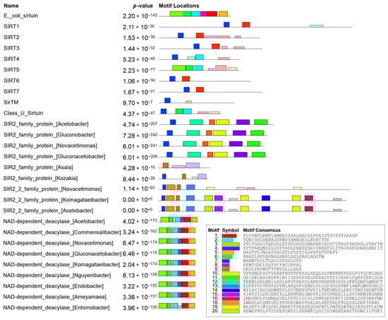 The MEME tool from MEME Suite 5.5.5 version [42] was used to perform motif discovery on protein sequences of sirtuins from AAB, Homo sapiens, E. coli, Class U sirtuin representative, and Class SirTM representative. The submission form was left on default, apart from the number of motifs being set to 20. Accession numbers for the results shown in Figure 7 are available in Section 3.5, while in Figure 8 the accession numbers of aligned protein sequences are already displayed.