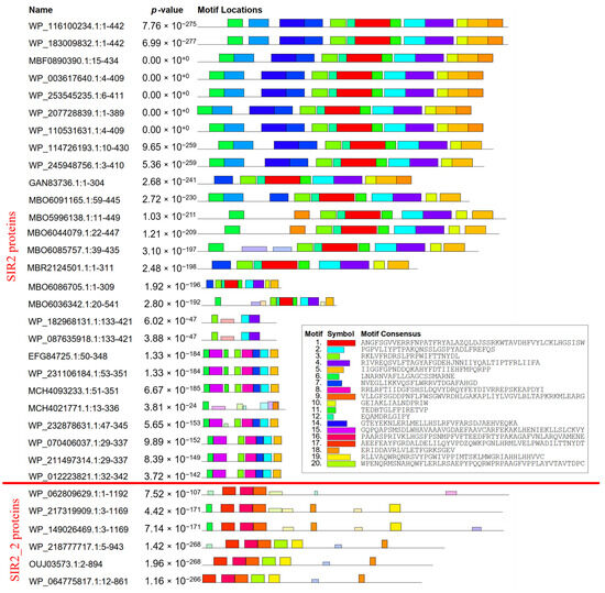 Comparing sequences of the new class (from SIR2_family_protein_[Acetobacter] to SIR2_2_family_protein_[Acetobacter]), we notice one motif occurring just in those nine sequences (Figure 7). It is the ninth motif (Figure S1), with an E-value of 3.9 × 10−57 and a width of 21. Therefore, it provides valuable information that this class of sirtuins is distinctive from others, making it a class of its own. Besides the previous comparison, the SIR2_2_family_protein group was compared to the SIR2_family_protein group. In SIR2_2 proteins, only the 13th motif is present and absent in all other sequences (Figure S2). This shows that there is a division inside the new class into two new subclasses. If we also consider the bootstrap values of those two separate lineages, it can be stated that there are two subclasses in the new class. Thus, this led us to compare the two subclasses with a larger sample (Figure 8). We can clearly see that they differ in three larger motifs—motifs 9, 16, and 17 (Figures S3–S5), which are only present in SIR2_2 proteins but not in SIR2 proteins, and one smaller motif—motif 3 (Figure S6), which is only present in SIR2 proteins but not in SIR2_2 proteins. Although the SIR2 protein subclass is more diverse in having more motifs than SIR2_2 proteins, they are similar in the second motif which is absent in SIR2_2 proteins (Figure 8).
