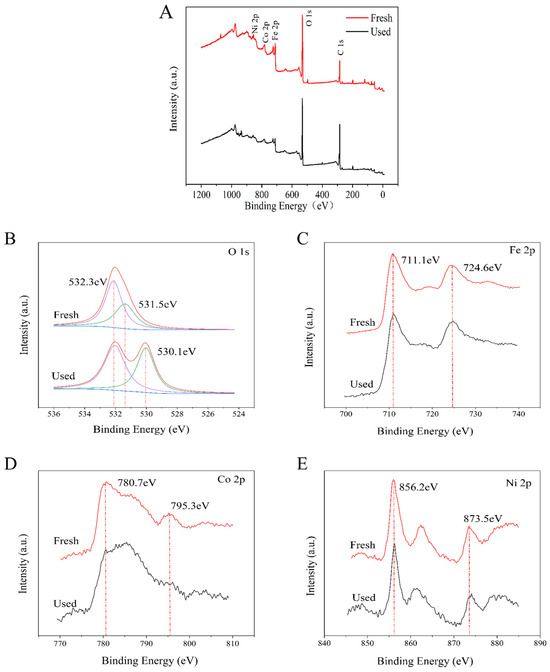 (A) XPS curves of fresh and used reaction NiCo2O4/MIL-Fe53; (B) high-resolution scan of O 1 s; (C) high-resolution scan of Fe 2p; (D) high-resolution scan of Co 2p; and (E) high-resolution scan of Ni 2p.
