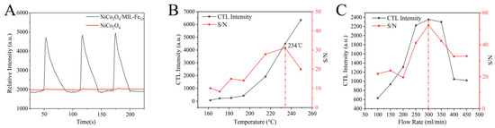 The influence of the incorporation of MIL-Fe53 on the CTL signal of NiCo2O4 has been investigated. Figure 5A shows the response signal intensities for CTL of isovaleraldehyde by a single NiCo2O4 material and NiCo2O4/MIL-Fe53 nanocomposites; the red line is the signal of a single NiCo2O4 material, and the black line is the signal of the NiCo2O4/MIL-Fe53 nanocomposite material. It is evident from the figure that the CTL signal strength of the nanocomposite sensor is very significantly improved compared to NiCo2O4, which indicates that the MIL-Fe53 component in the nanocomposite material really improves the performance of the sensor. In order to be able to better study the CTL properties of NiCo2O4/MIL-Fe53 nanocomposite sensors, the effects of the reaction temperature and carrier gas flow rate on the CTL performance of the NiCo2O4/MIL-Fe53 nanocomposite sensors have been explored.