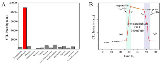 (A) CTL response of the sensor to different compounds (temperature: 234 °C; flow rate: 300mL/min); (B) characterization of the response of the isovaleraldehyde sensor.