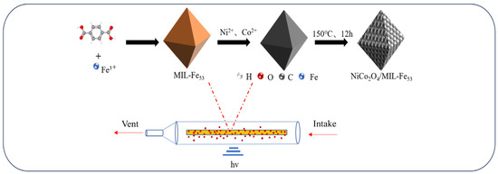 NiCo2O4/MIL-Fe53 nanocomposites were synthesized by the hydrothermal method. In the first step, NiCo2O4 monomer material was synthesized first. A solution was prepared by dissolving 1 mmol of NiCl2·6H2O and 2 mmol of CoCl2·6H2O in a mixture of 20 mL of ultrapure water and 20 mL of ethanol and then adding 15 mmol of urea and stirring it until dissolved. It was then transferred to an autoclave and reacted for 12 h at 120 °C, with centrifugal washing and drying for 24 h at 60 °C. Afterward, crushing and annealing took place at 350 °C for 3 h to obtain a black NiCo2O4 powder. In the second step, the NiCo2O4 monomer material was compounded with MIL-Fe53. The prepared 1 mmol of NiCo2O4 was added to 110 mL of DMF and treated with ultrasonication. Then, 4 mmol of FeCl3·6H2O and 5 mmol of H2BDC were added, stirred until dissolved and loaded into an autoclave. Then, the reaction mixture was subjected to a thermal treatment at 150 °C for a duration of 12 h, followed by cooling to room temperature, and then centrifuged and washed and dried at 60 °C for 12 h, and finally, the NiCo2O4/MIL-Fe53 powder was obtained.