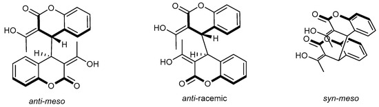 Analysis of the NMR spectral data for products 2b–f,2h suggests the presence of two rotational stereoisomers, in which all protons are chemically equivalent, Table 7. The 1H NMR spectra displayed two equally intense lines for the methyl groups from the COCH3 group, and the H-4 and H-4′ protons indicated the presence of two isomers. The chemical shifts of the two methyl groups of the enolized acetyl group, as well as the methyl groups of the methoxy groups in the sixth and eighth positions, could suggest an anti-conformation at the C4-C4′ bond. The ratio is a little dependent on the solvent. It seems that there are two possible stereoisomers with anti-disposition of the coumarin fragments in the meso-isomer (C2v symmetry) and anti-disposition in the racemic conformers, Figure 3.