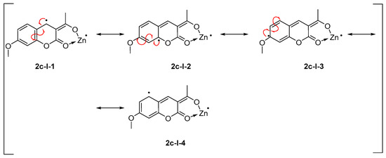 It is interesting to note that, even though the yields from the homodimerization reaction obtained by Method B were low, the reaction time for the full conversion of the starting coumarin was shorter. The lower yields might be a result of undergoing a side reaction—additional products were observed while following the reaction by TLC. The additional products might be due to the slightly basic conditions when Zn(OAc)2x2H2O was used. It is known from the literature [7,30,31,32] that coumarins are not very stable in basic conditions because the lactone moiety could undergo a ring opening. In both cases, the reaction with the acetyl derivative bearing a -OMe group at position 7 was not successfully accomplished. This result might be explained by the instability of the formed radical species 2c-I-3, where the same C atom would bear the radical and the methoxy group, Scheme 2.