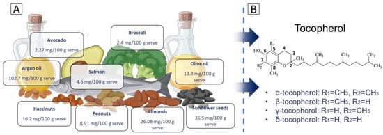 Dietary sources and structural variants of tocopherols: (A) key dietary sources of tocopherols, including argan oil, avocado, broccoli, salmon, hazelnuts, almonds, sunflower seeds, peanuts, and olive oil, with their respective tocopherol content per serving. (B) The chemical structure of tocopherol, highlighting the differences in methyl group positions that distinguish alpha (α), beta (β), gamma (γ), and delta (δ) tocopherols.