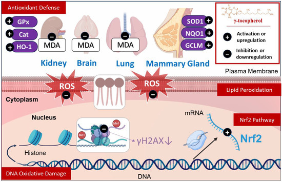 γ-tocopherol’s therapeutic effects in oxidative stress: γ-tocopherol’s role in reducing lipid peroxidation (via suppression of MDA and ROS production), mitigating DNA oxidative damage (indicated by reduced γH2AX, 8-oxo-dG, and PHIP-induced damage), enhancing antioxidant defense systems (elevating levels of GPx, SOD1, Cat, NQO1, HO-1, and GCLM), and its involvement in the Nrf2 pathway (inducing Nrf2 activation and antioxidant gene expression).