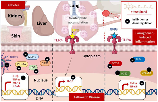 γ-tocopherol’s therapeutic effects in inflammatory and metabolic diseases: γ-tocopherol modulates inflammation and oxidative stress in diabetes (by reducing CRP, MCP-1, IL-1β, TNF-α, and NLRP3, while enhancing p53, PGC-1α, and SIRT1), carrageenan-induced inflammation (by lowering LTB4, TNF-α, PGE2, COX-2, VCAM-1, and NF-κB), and asthmatic disease (by decreasing neutrophilic accumulation and IL-1β levels in LPS-induced inflammation).