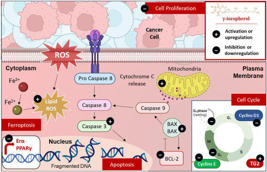 The discovery of novel cell death pathways has significantly expanded our understanding of how cells respond to various forms of cellular damage. Apoptosis and ferroptosis are two critical forms of cell death that are intricately linked in cancer treatment [70,71]. Apoptosis, a regulated process, is often dysregulated in cancer, leading to uncontrolled cell proliferation; therapies that activate apoptotic pathways or inhibit anti-apoptotic proteins hold promise for inducing cancer cell death [72]. Ferroptosis, on the other hand, is a distinct form of programmed cell death that is characterized by the accumulation of lipid hydroperoxides to lethal levels, leading to membrane damage and cell death [73]. It is characterized by iron and lipidic ROS/peroxides’ accumulation due to the Fenton reaction and via the loss of balance in ROS production and cell glutathione (GSH)-dependent antioxidants, which protect cells from lipid peroxidation [74]. Emerging evidence suggests that ferroptosis may have a tumor-suppressive function by removing cells that lack access to critical nutrients or have been compromised by infection or environmental stress [75]. Jiang et al. showed that γ-tocopherol treatment induced apoptosis in prostate cancer cells [76] (Figure 4). γ-tocotrienol was more effective than γ-tocopherol to inhibit prostate tumor growth in vivo [77]. Furthermore, according to Gopalan et al., γ-tocopherol triggers apoptosis and enhances the expression of death receptor-5 in human breast cancer cells [78]. Mechanistic analysis revealed that treatment with γ-tocopherol leads to the intracellular buildup of dihydroceramides and dihydrosphingosine in prostate cancer cells [79], as well as ceramides and dihydroceramides in breast cancer cells [78]. The use of chemical inhibitors to block de novo ceramide biosynthesis significantly reduced γ-tocopherol’s apoptotic effects [78,79]. These results highlight that γ-tocopherol’s anticancer properties are mediated through its influence on the de novo synthesis of sphingolipids. Regarding its metabolites, while γ-tocopherol -13′-COOH has not been specifically investigated, similar metabolites such as δT-13′-COOH and δTE-13′-COOH have been shown to inhibit the proliferation of colon cancer cells, while having minimal effect on normal cells [80].