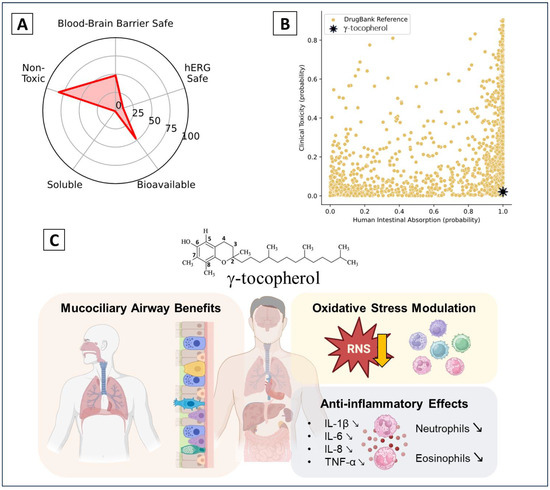 γ-tocopherol’s properties and effects. (A) Favorable pharmacokinetic and safety profile (bioavailability, solubility, and non-toxicity)—information obtained from https://admet.ai.greenstonebio.com (accessed on 16 December 2024); (B) high absorption and low toxicity compared to other compounds—information obtained from https://admet.ai.greenstonebio.com (accessed on 16 December 2024); and (C) clinical trial’s key biological effects.