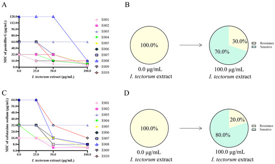 After co-incubation with different concentrations of I. tectorum extract for 0.5 h, the resistance of the strains to penicillin G and cefotaxime decreased to varying degrees (Figure 1A,C). Under the action of 100.0 μg/mL of I. tectorum extract, 70% of the strains regained their sensitivity to penicillin G, and 80% of the strains regained their sensitivity to cefotaxime (Figure 1B,D).