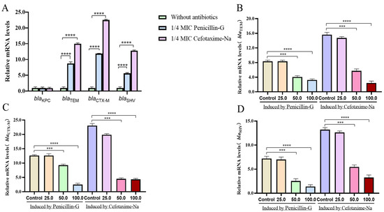 Four strains, namely E001 (blaTEM), E002 (blaCTX-M), E003 (blaKPC), and E004 (blaSHV), which were resistant to penicillin G and cefotaxime sodium and contained only a single ESBL gene were selected. There was a significant upregulation in the transcript levels of blaTEM, blaCTX-M, and blaSHV induced by 1/4 MIC of penicillin G and cefotaxime sodium (Figure 2A) (p < 0.0001).