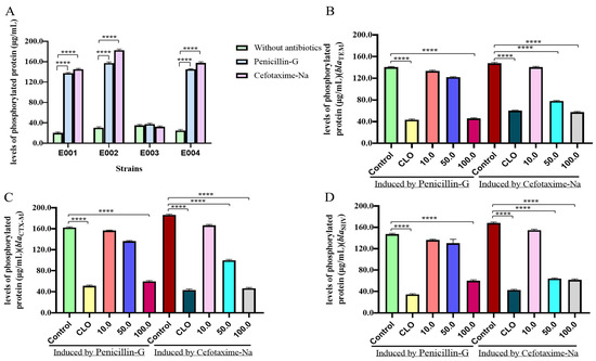 The phosphorylation levels of E001 (blaTEM), E002 (blaCTX-M), E003 (blaKPC), and E004 (blaSHV), which were induced by penicillin G and cefotaxime sodium, increased significantly, with the exception of E003 (Figure 3A) (p < 0.0001).
