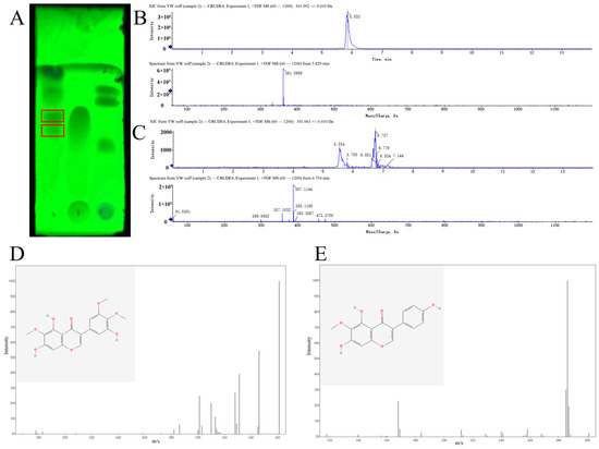 Using the flavonoid extraction method, we obtained 154.0 mg of extract from 200 g of dried rhizomes. With 80% ethanol as a blank, the absorbance was measured at 266.5 nm wavelength, and the standard curve was drawn with the absorbance value of the sample as the vertical coordinate (A) and the concentration as the horizontal coordinate (C), as shown in Supplementary Materials Figure S1. Moreover, the 154.0 mg crude extract contained 36% total flavonoids. Thin-layer chromatography (TLC) showed that there were two types of flavonoids in I. tectorum extract (Figure 4A). These two substances were identified as irigenin and tectorigenin in the liquid chromatography–mass spectrometry (LC-MS) assay (Figure 4B–E).