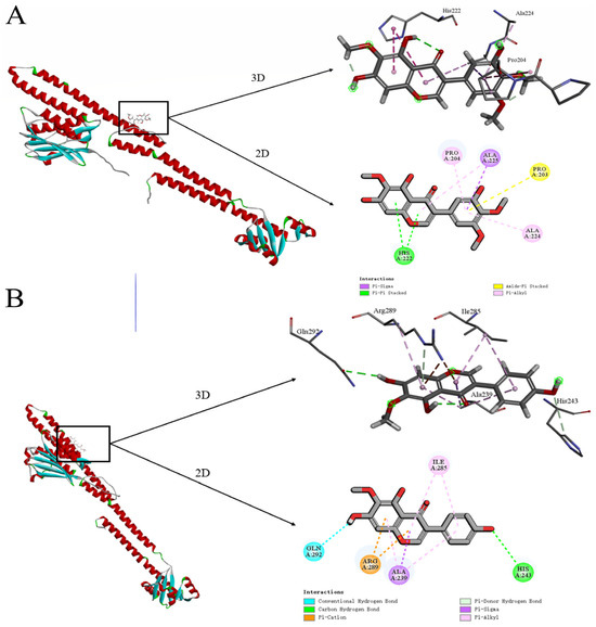 (A) Irigenin molecular docking schematic diagram. (B) Tectorigenin molecular docking schematic diagram.