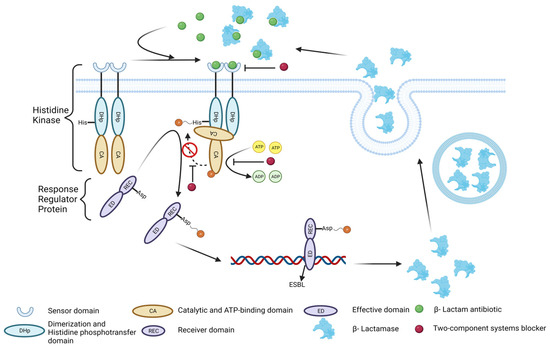 The TCSS is an important signal transduction system that is associated with bacterial resistance. According to the amino acid types of their phosphorylated substrate proteins, their protein kinases can be divided into three categories: serine threonine kinase (SK), tyrosine kinase (TK), and HK, among which HK is the main regulator of E. coli gene expression. When β-lactam antibiotics reach the surface of bacteria as a stimulus signal, they can bind to HK receptors and transmit the signal into the cell. Thus, histidine in the catalytic site of intracellular histidine kinase can be activated by ATP phosphorylation. Subsequently, RRP can transfer the phosphate group from HK histidine residues to its own aspartic acid residues, making it phosphorylated and activated, thus obtaining the ability to bind to the ESBLs gene promoter and regulate its expression, reversing bacterial resistance to β-lactam antibiotics (Figure 6) [27,28,29,30]. Among these steps, self-phosphorylation activation of HK is a key step in the initiation of the TCSS [28]. In addition, we found that 1/4 MIC of penicillin G and cefotaxime sodium significantly enhanced the protein phosphorylation level of E. coli. This result indicates that the resistance of E. coli to β-lactam antibiotics is regulated by the TCSS.