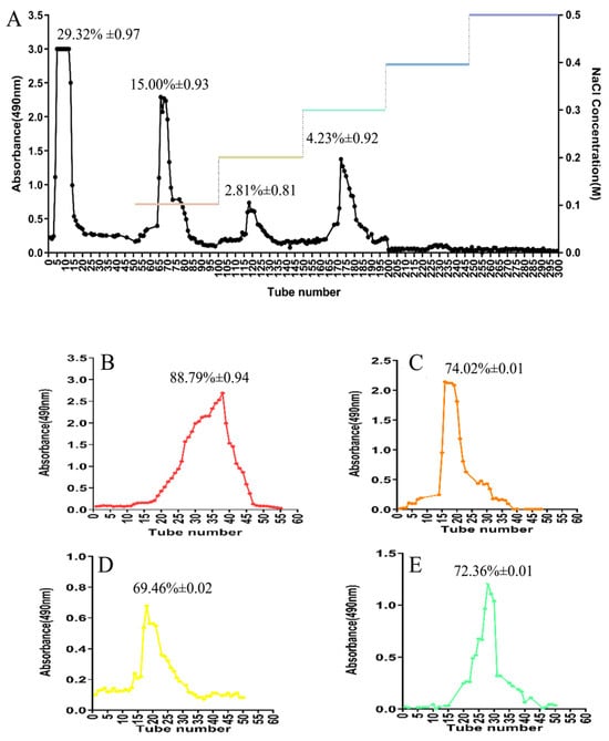 Fractionation of the AOP extract by DEAE-52 and Sephadex G-100 chromatography. Note: (A): elution profile of the crude AOP extract on a DEAE-52 anion exchange column, the yields of polysaccharides elution with distilled water, 0.1 M NaCl, 0.2 M NaCl, and 0.3 M NaCl were 29.32%, 15.00%, 2.81%, and 4.23% of the total AOP, respectively. (B–E): Elution profiles of fractions from the DEAE column after further fractionation on a Sephadex G-100 size-exclusion column, (B–E) corresponded to elution with distilled water (red color), 0.1 M NaCl (orange color), 0.2 M NaCl (yellow color), and 0.3 M NaCl (green color) with total sugar contents were 88.79%, 74.02%, 69.46%, and 72.36%, respectively.