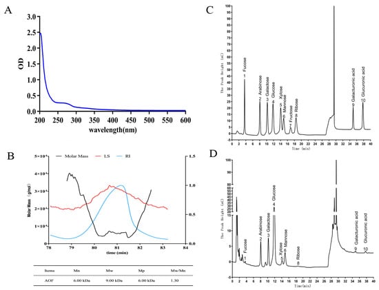 Molecular weight, monosaccharide composition and UV-spectra of AOP. Note: (A): UV-spectra of AOP; (B): molecular mass determination of AOP obtained from GPC-MALS-RI; (C,D): monosaccharide composition of monosaccharide standards and AOP obtained from ion chromatography.