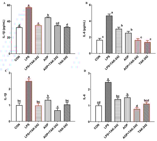 Effects of AOP on contents, gene expression of inflammatory cytokines in PBLs blocked by TAK-242. Note: (A,B): quantification of IL-1β and IL-6 protein levels in culture supernatants using enzyme-linked immunosorbent assays. (C,D): the relative mRNA expression of IL-1β and IL-6 determined by quantitative real-time PCR. Red lines represent groups treated with lipopolysaccharide. CON (Control group), LPS (lipopolysaccharides), AOP (Artemisia ordosica Krasch. polysaccharides), and IL (interleukin). each value is shown as mean ± SEM (n = 6). Different letters above bars indicate statistically significant differences between groups (p < 0.05).