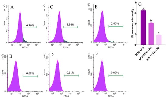 Competitive inhibition effects of AOP on receptors of PBLs combined with FITC-LPS. Note: (A): FITC-LPS group, (B): CON group, (C): LPS + FITC-LPS group, (D): LPS group, (E): AOP + LPS group, (F): AOP group, (G): average fluorescence intensity of LPS-FITC, LPS + LPS-FITC, and AOP + LPS-FITC groups. Each value is shown as mean ± SEM (n = 6). Different letters above bars indicate statistically significant differences between groups (p < 0.05).