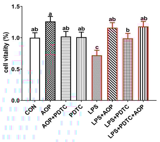 Previous studies have demonstrated that polysaccharide-based compounds enhance immune cell proliferation and differentiation while maintaining low cytotoxicity [27,28,29]. In alignment with these findings, AOP significantly protected LPS-induced cytotoxicity in broiler chicken lymphocytes. As shown in Figure 5, the viability of PBLs decreased markedly following LPS treatment relative to untreated controls, whereas cell viability of LPS + AOP treated cells and the LPS + PDTC + AOP treated populations were significantly higher than LPS treatment alone (p < 0.05), while all other treatment groups had no significant effect on cell viability. Moreover, research suggests that polysaccharides compounds not only exert their mitigating effects by promoting the proliferation of immune cells but also by restoring changes in cell morphology induced by LPS. Xu et al. (2020) [30] found that when monocytes/macrophages were stimulated with LPS, these cells underwent morphological changes. The addition of Astragalus polysaccharides nanoparticles could directly act on immune cells, restore cell morphology, make cells return to their oval shape, improve cell membrane damage, and reduce extracellular fluid leakage, thus exerting anti-inflammatory effects. However, this study did not investigate the impact of AOP on changes in lymphocyte morphology under stress or non-stress conditions. Therefore, further studies are warranted to investigate how AOP can restore structural alterations in cell morphology under conditions of immune stress.