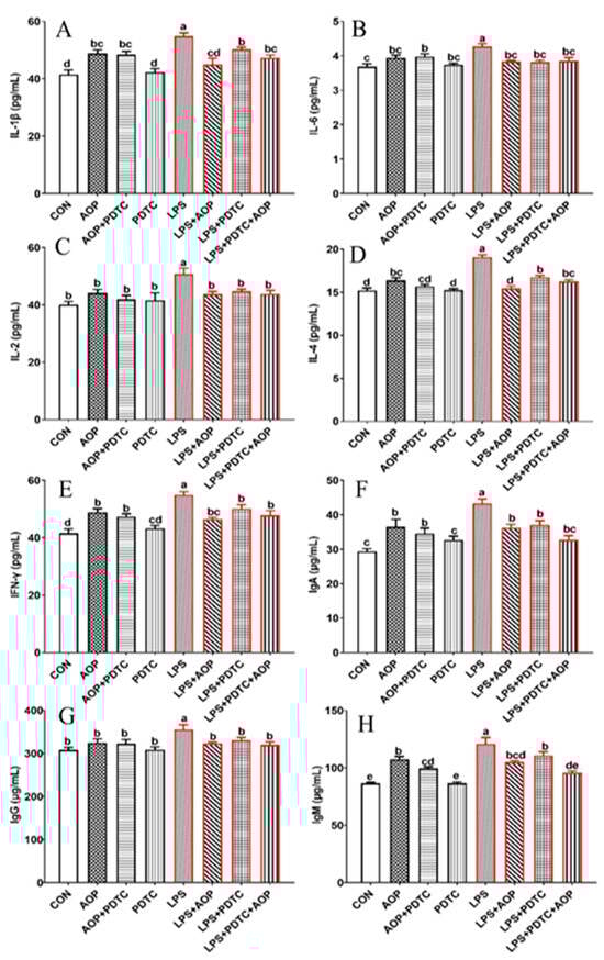 Lastly, we investigated whether AOP mitigates inflammation through TLR4/NF-κB pathway modulation in PBLs. Using PDTC (an NF-κB p65 inhibitor), cells were assigned to eight treatment groups: (1) control group (CON), (2) AOP group (150 μg/mL AOP, 30 min exposure), (3) AOP with PDTC group (10 μmol/mL PDTC for 30 min, followed by 150 μg/mL AOP), (4) PDTC group (10 μmol/mL PDTC, 30 min exposure), (5) LPS group (10 μg/mL LPS for 6 h), (6) AOP with LPS group (150 μg/mL AOP pretreatment for 24 h, followed by 10 μg/mL LPS for 6 h), (7) LPS with PDTC group (10 μmol/mL PDTC for 30 min, followed by 10 μg/mL LPS for 6 h), and (8) combined PDTC, AOP, and LPS group (10 μmol/mL PDTC and 150 μg/mL AOP pretreatment for 30 min and 6 h, respectively, followed by 10 μg/mL LPS for 6 h). We measured the levels of immune markers [interleukin (IL)-1β, IL-2, IL-4, IL-6, IFN-γ, and immunoglobulins (IgG, IgA, and IgM)] in the culture medium, along with TLR4/NF-κB pathway-related gene expression.