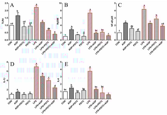 Effects of AOP on gene expression of NF-κB signal pathway in PBLs challenged by LPS and blocked by PDTC. Note: (A–E): the gene expression levels of TLR4 (toll like receptor 4), MyD88 (myeloid differentiation primary response 88), NF-κB p65 (nuclear factor kappa-B p65), IL-1β (interleukin-1β), and IL-6 (interleukin-6) were detected by qRT-PCR. Red lines represent groups treated with lipopolysaccharide. CON (control group), LPS (lipopolysaccharide), AOP (Artemisia ordosica Krasch. polysaccharides), and PDTC (NF-κB inhibitor). β-actin was used as a housekeeping gene. The relative expression levels from the control group were used as reference values. Each value is shown as mean ± SEM (n = 6). Different letters above bars indicate statistically significant differences between groups (p < 0.05).