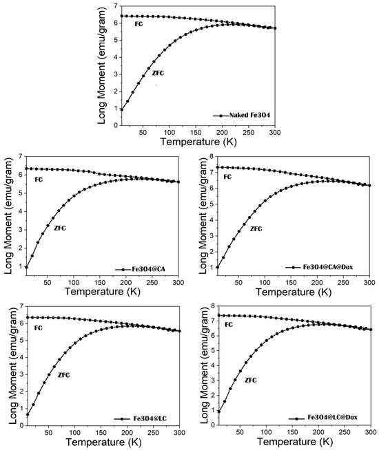 The ZFC–FC measurements from 10 K to 300 K in 100 Oe show a broad maximum on the ZFC curve in the range of 190–230 K, depending on the investigated samples (see Figure 1). So, blocking temperatures, TB ranging from 210 to 222 K for different samples can be found from the maximum of the ZFC curves (see Table 1 and Table 2). Notably, TB represents the temperature where the transition from the magnetically frozen regime to the superparamagnetic regime of MNPs takes place within the time windows of the measuring method (e.g., this is in the range from 1 to 100 s in the case of magnetic measurements). The flat shape of this maximum, along with the smooth divergence of the ZFC and FC curves, points to a wide distribution of the anisotropy energies (KV) of MNPs, where K is the anisotropy constant, and V is the volume of MNPs. However, the FC curve always develops over the ZFC curve, supporting the nature of magnetic monodomain nanoparticles. These results not only reveal the very broad size distribution of the naked and functionalized MNPs, especially extended at larger sizes (please see the findings confirmed by previous TEM investigations, according to [30]), but also quite similar magnetic relaxation phenomena that are specific to all investigated systems.
